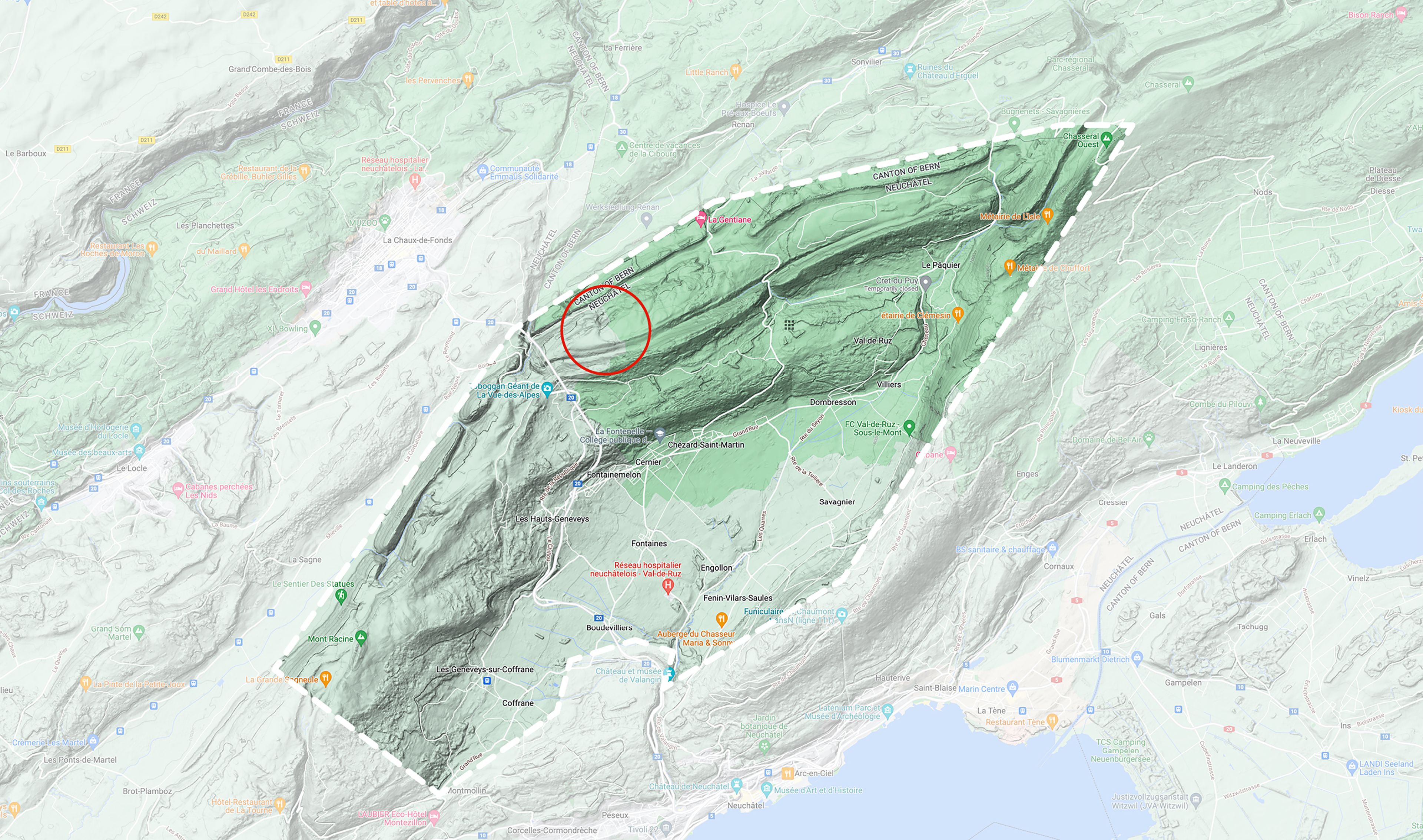 Le périmètre d’implantation du parc éolien projeté se retrouve entre le Mont-Perreux à l’ouest et les Sagnettes à l’est, dans le Jura neuchâtelois.